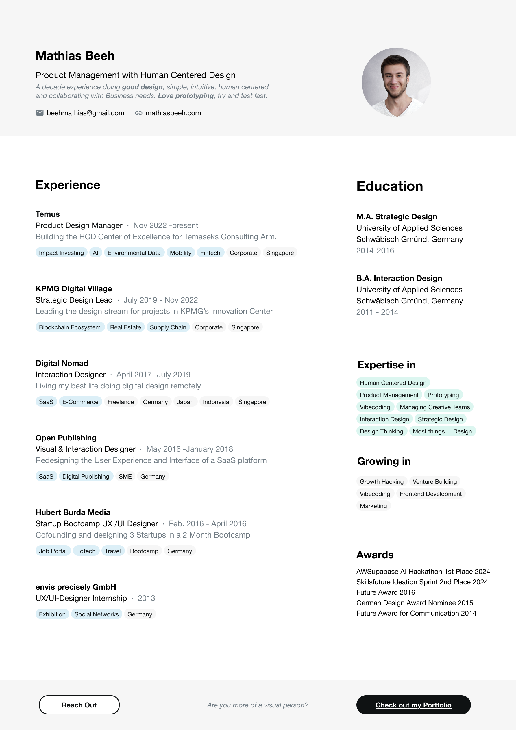 Hi, I am Mathias, a Strategic and Interaction Designer from Germany, living in Singapore. I'm interested in shaping the future of humanity. You can see my CV below. If you have any questions or want to get in contact, feel free to send me a mail: